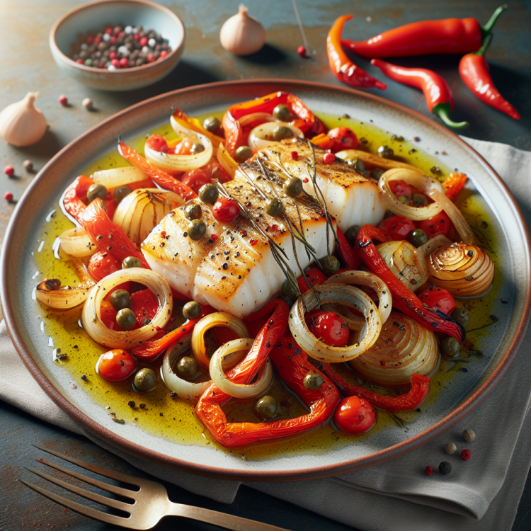 Arrange cod, peppers, onion, and capers on baking sheet. Drizzle with olive oil and lemon juice, season with salt and pepper.