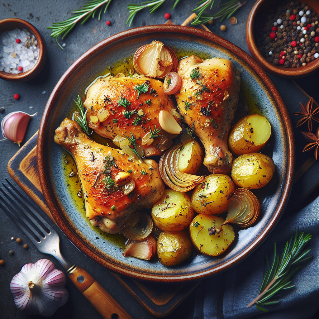 Toss chicken thighs with olive oil, garlic, onion, and thyme. Season with salt and pepper.