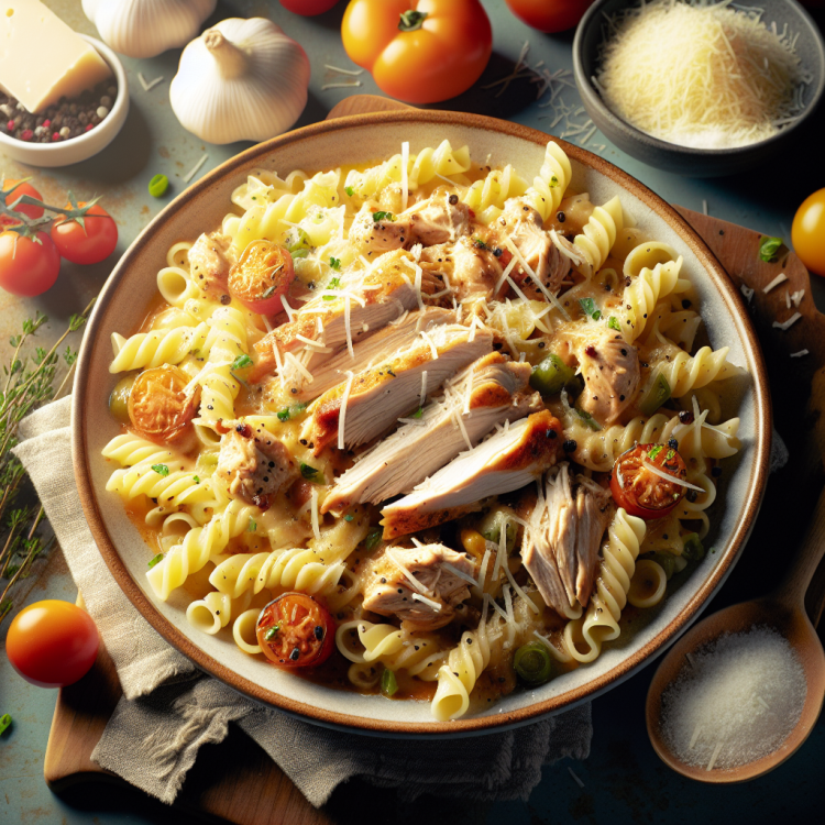 Combine pasta with chicken mixture, sprinkle with parmesan, and serve.