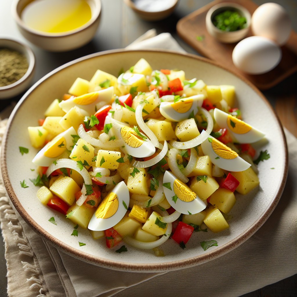 - Combine potatoes, eggs, onion, and bell pepper in a bowl.