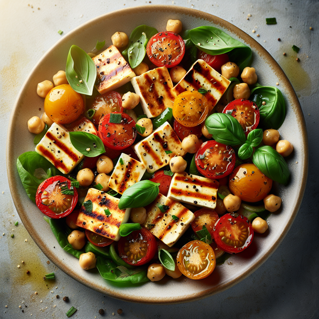 Top with reserved vegetables, cherry tomatoes, and halloumi.