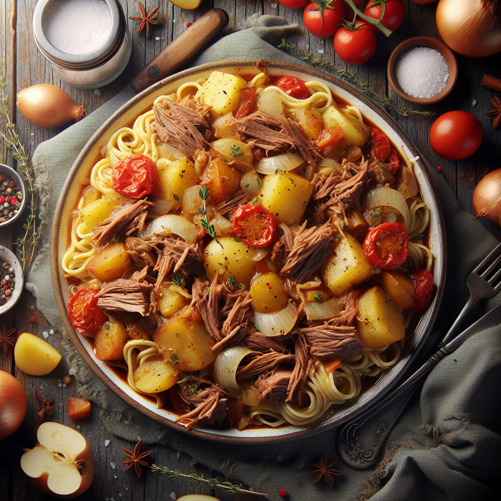 Add shredded beef, diced potatoes, beef broth, and canned tomatoes.