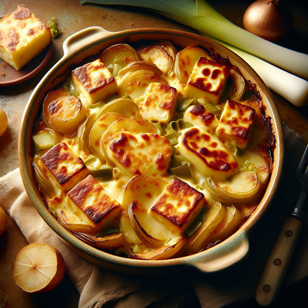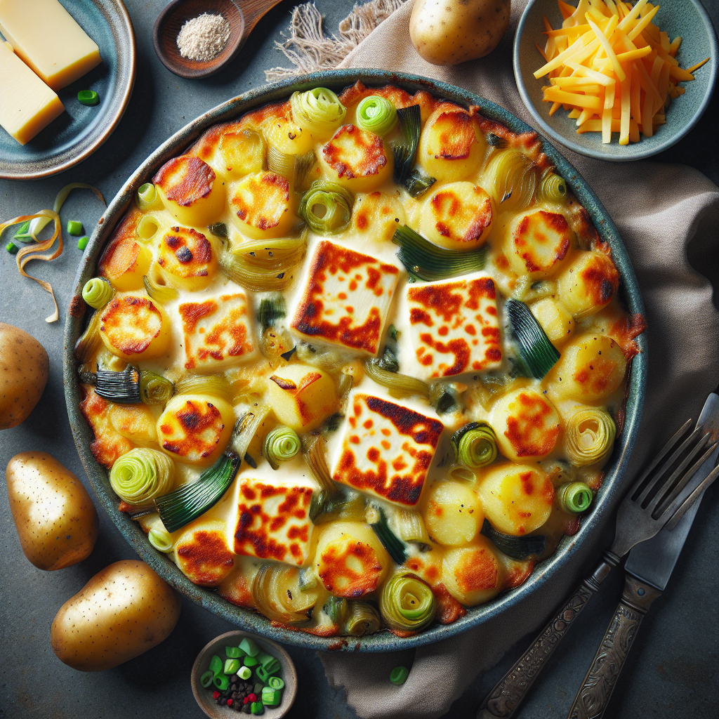 In a greased baking dish, layer potatoes, leeks, and remaining halloumi.