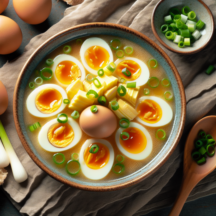 Slowly drizzle beaten eggs into the soup, stirring gently.