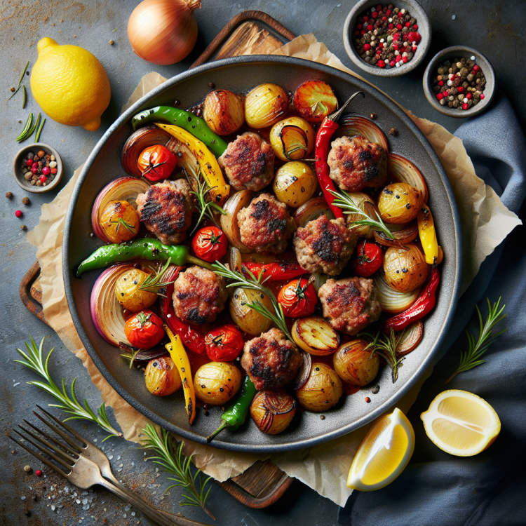 Lay veggies on a sheet pan. Form small meatballs with pork, mixing in rosemary, barbecue rub, and remaining garlic.