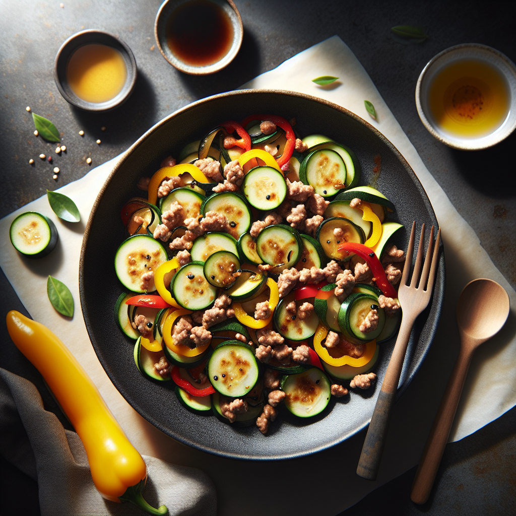 - Heat olive oil in a large pan over medium heat. Add zucchini and bell pepper, stir-fry until tender.