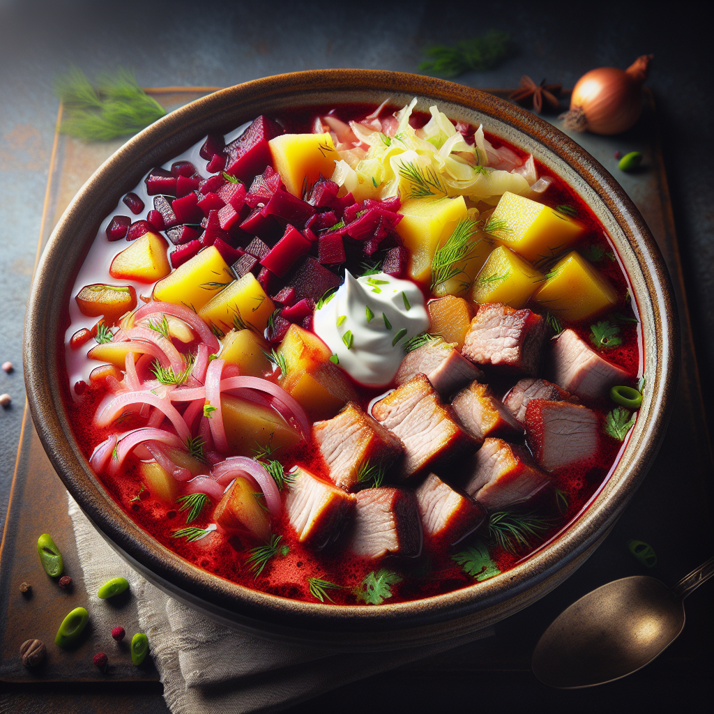 Explore the comforting flavors of Ukrainian home cooking with pork loin, featuring sunflower oil, dill, garlic, and beet.