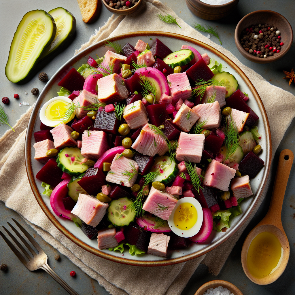 - In a bowl, combine pork, beetroots, cucumbers, vinegar, and sunflower oil.