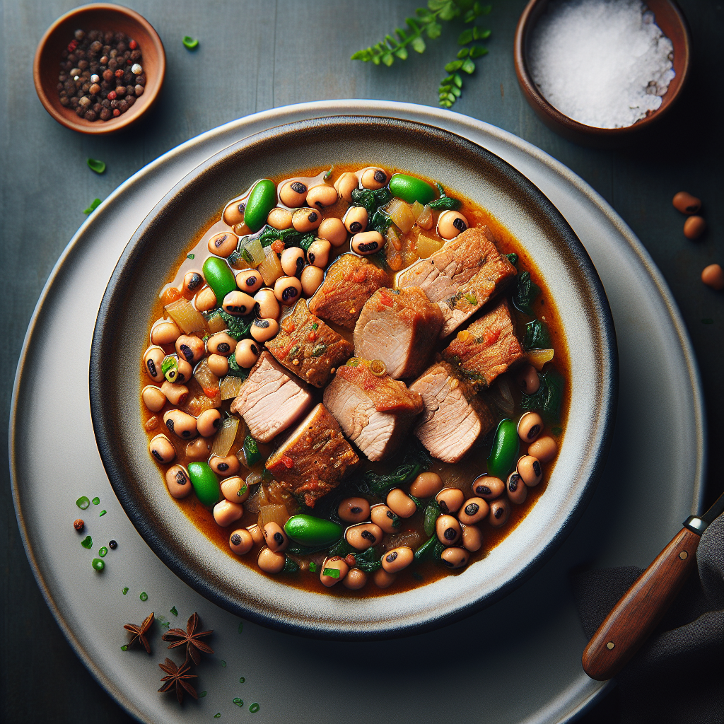- Combine reserved pork, black-eyed peas, onion, and broth in a pot.