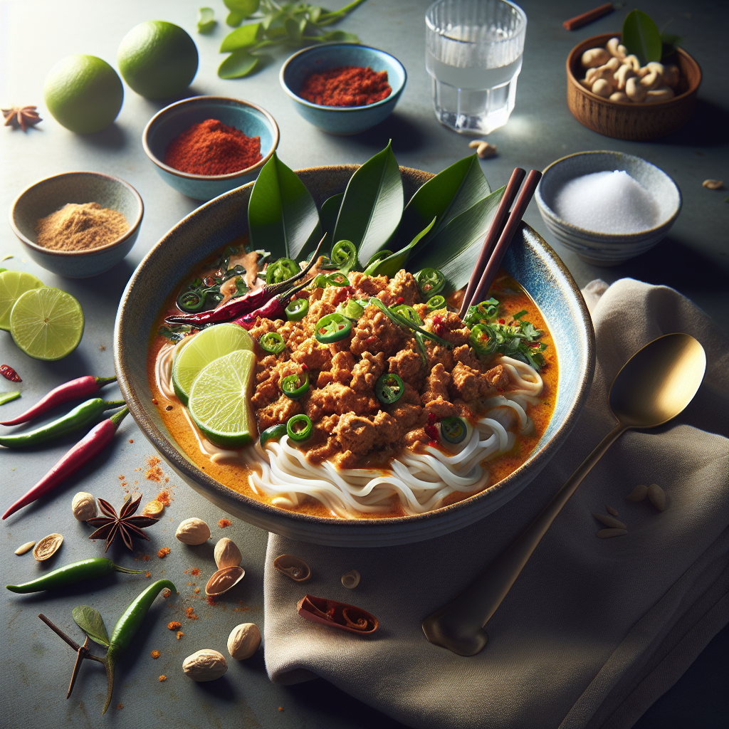 Serve over noodles, garnished with laksa leaves and lime wedges.