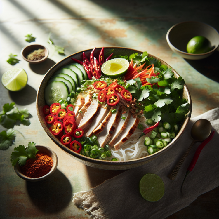 In bowls, layer cooked rice noodles, vegetables, cucumber, and red chili.